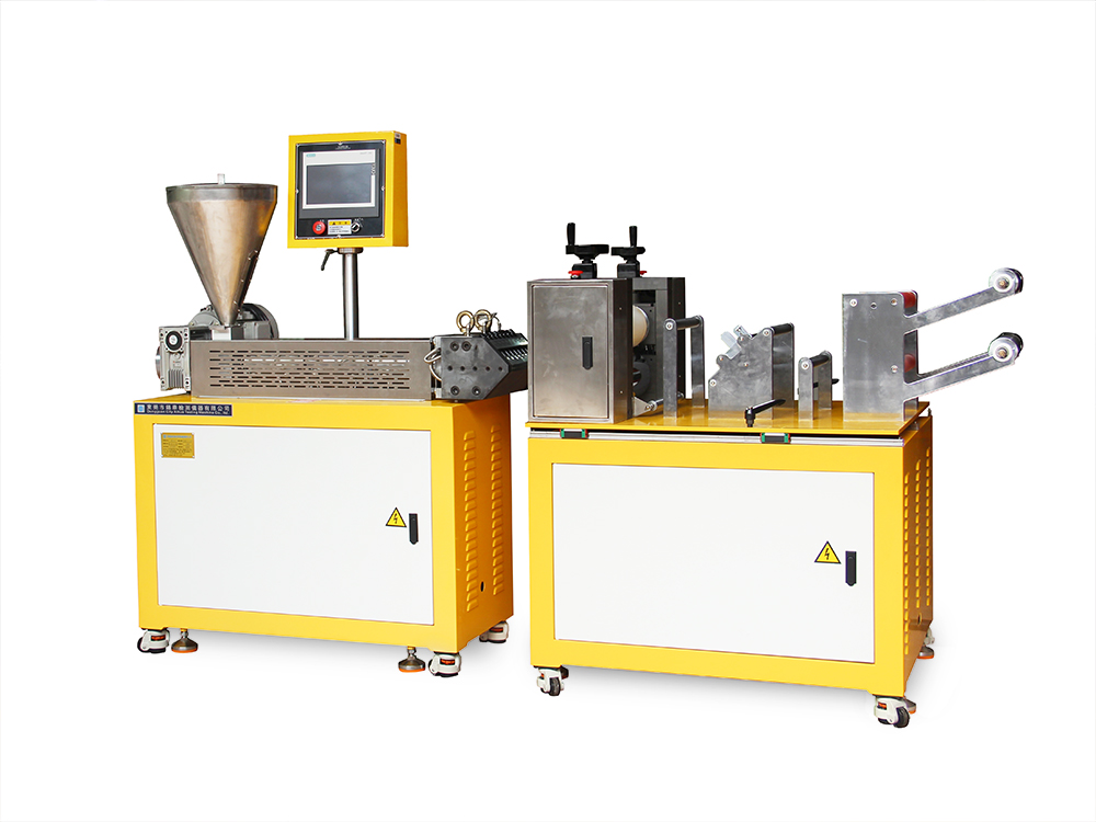 其工作原理為:物流從料斗里放入經(jīng)過擠出裝置的塑化和擠出變?yōu)榱餮訝顟B(tài),再從主機經(jīng)模頭出來,通過兩輥壓延機進行壓延
